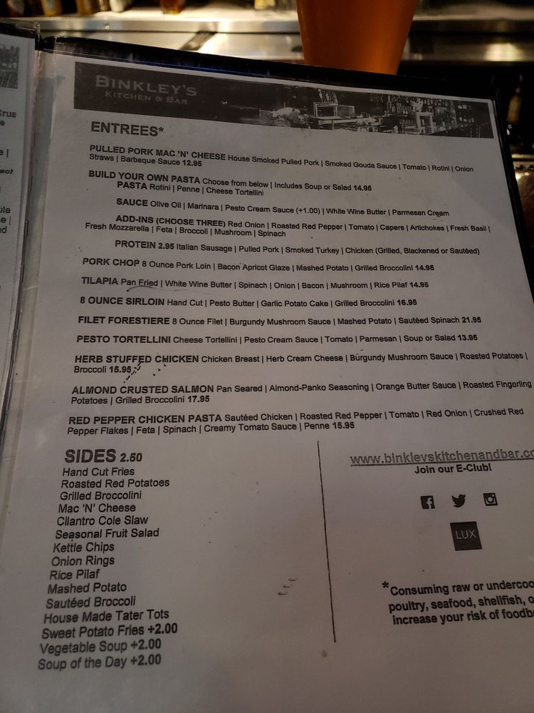 Binkleys Kitchen & Bar is a charming American restaurant located in Indianapolis, IN. This women-owned establishment offers a variety of dishes that cater to different dietary preferences, including vegan options. From their delicious 3 Cheese Pizza to the savory Breaded Mushrooms appetizer, there is something for everyone to enjoy. The menu also features delightful salads like the Salmon Salad and Strawberry Chicken Salad, packed with fresh ingredients and bursting with flavor. Binkleys Kitchen & Bar provides a casual dining experience with a full bar, outdoor seating options, and even happy hour specials. The warm and inviting atmosphere, paired with the attentive waiter service, makes this restaurant a great choice for a memorable dining experience. So, if you're in the area, be sure to visit Binkleys Kitchen & Bar for a delightful meal.